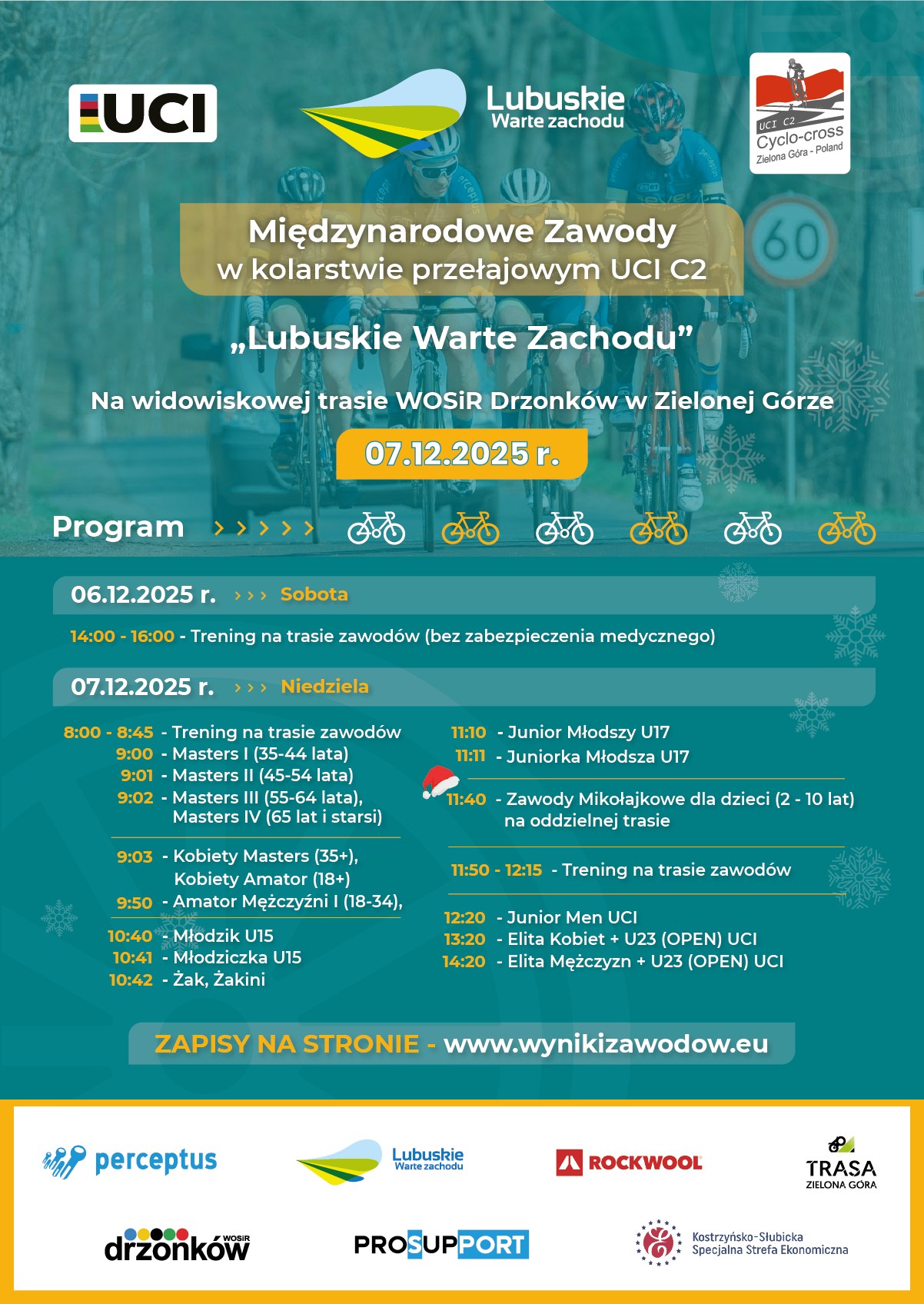 W dniu 7.12.2025 odbędą się zawody „Lubuskie Warte Zachodu” Międzynarodowe zawody w kolarstwie przełajowym UCI C2.W tym dniu odbędzie się Wyścig w Kolarstwie Przełajowym oraz Wyścig Mikołajkowy dla Dzieci.Obiekty: Teren rekreacyjny, plac piknikowy, strzelnica plenerowa.Organizator: LKS Trasa Zielona Góra, WOSiR Drzonków.2025-12-07, 09:00:00 czytaj dalej