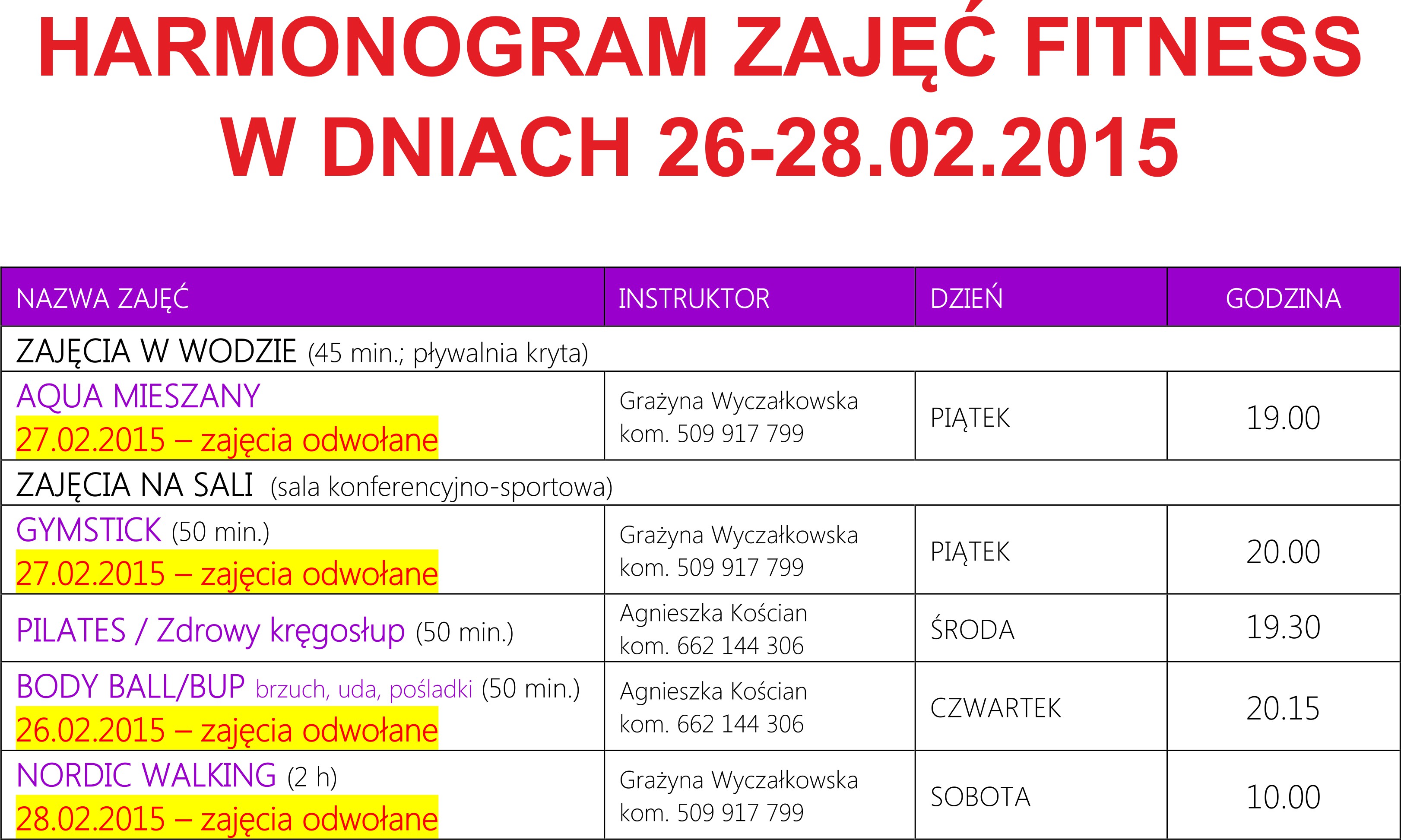 Informujemy, że w dniach 26-28.02.2015 r., zostają odwołane następujące zajęcia fitness. Za utrudnienia przepraszamy.