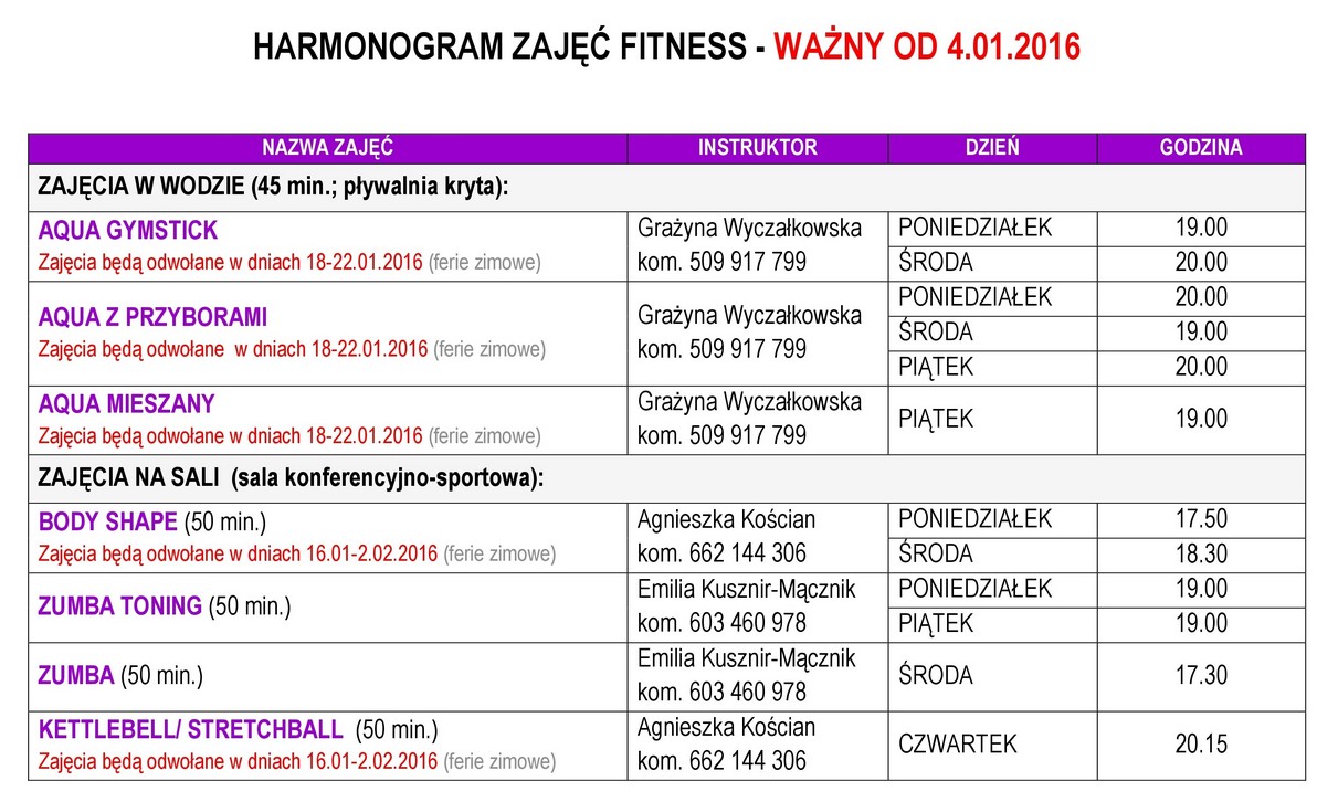 Informujemy, że od 4 stycznia 2016 r., ulega zmianie harmonogram zajęć fitness.