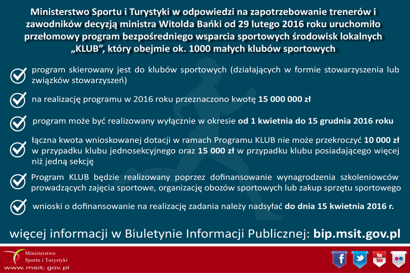 W dniu 29.02.2016 r. weszła w życie Decyzja nr 18 Ministra Sportu i Turystyki z dnia 26.02.2016 r. w sprawie ogłoszenia Programu „KLUB” w ramach rozwijania sportu poprzez wspieranie przedsięwzięć z zakresu upowszechniania sportu dzieci i młodzieży.