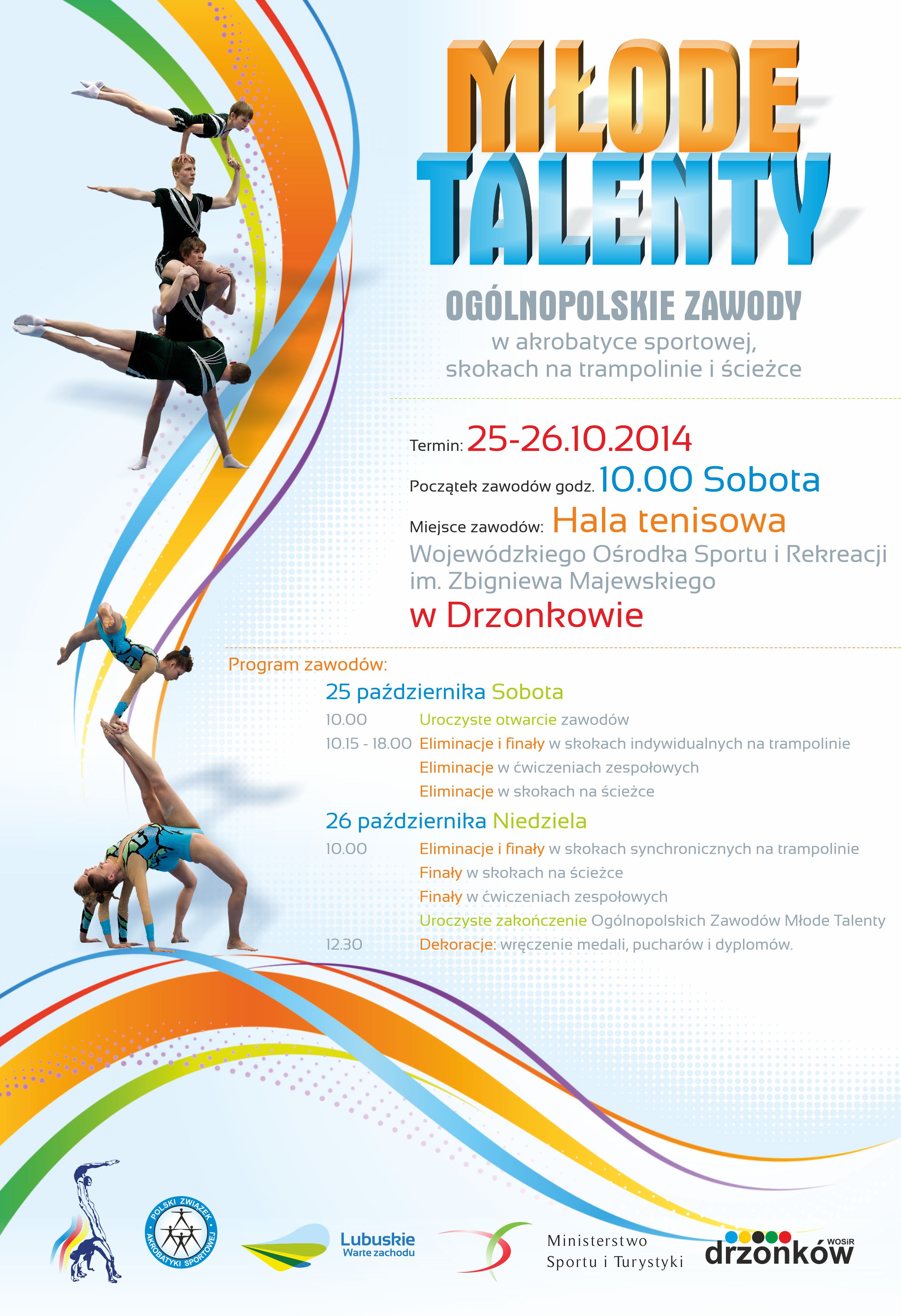 W Hali Tenisowej Wojewódzkiego Ośrodka Sportu i Rekreacji kolejne wielkie wydarzenie. Ogólnopolskie zawody w akrobatyce sportowej, skokach na trampolinie i ścieżce – Młode Talenty już 25-26.10.2014r. Zapraszamy!