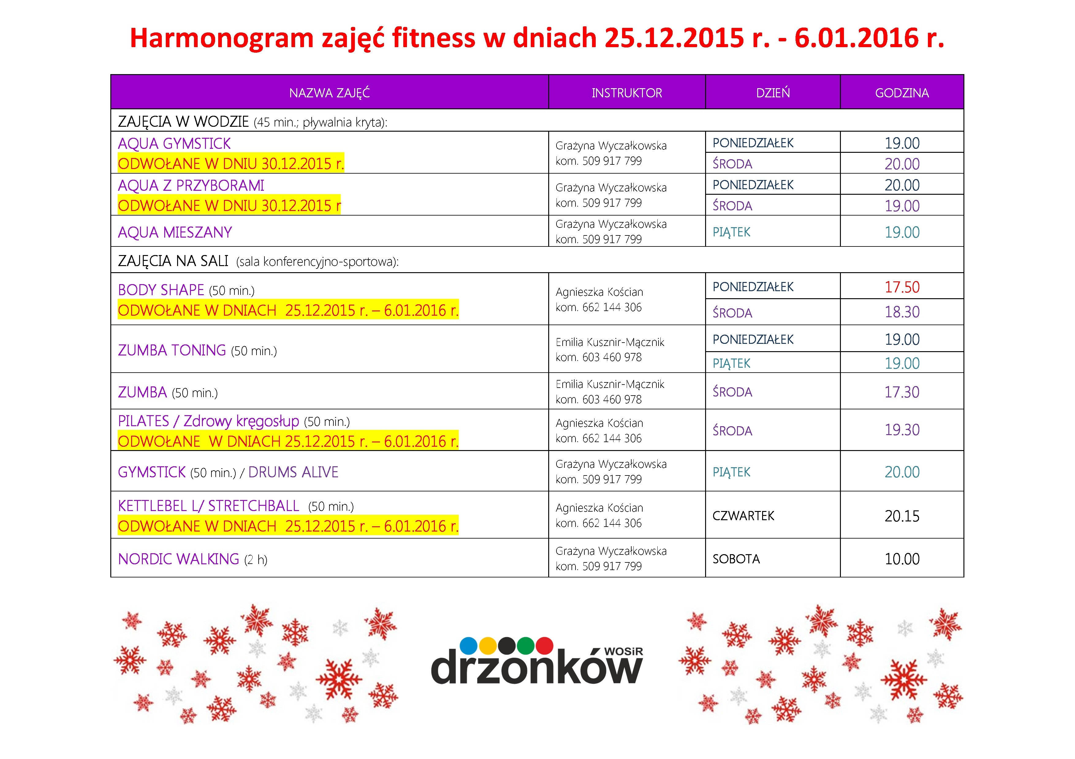 ŚWIĄTECZNY HARMONOGRAM ZAJĘĆ FITNESS