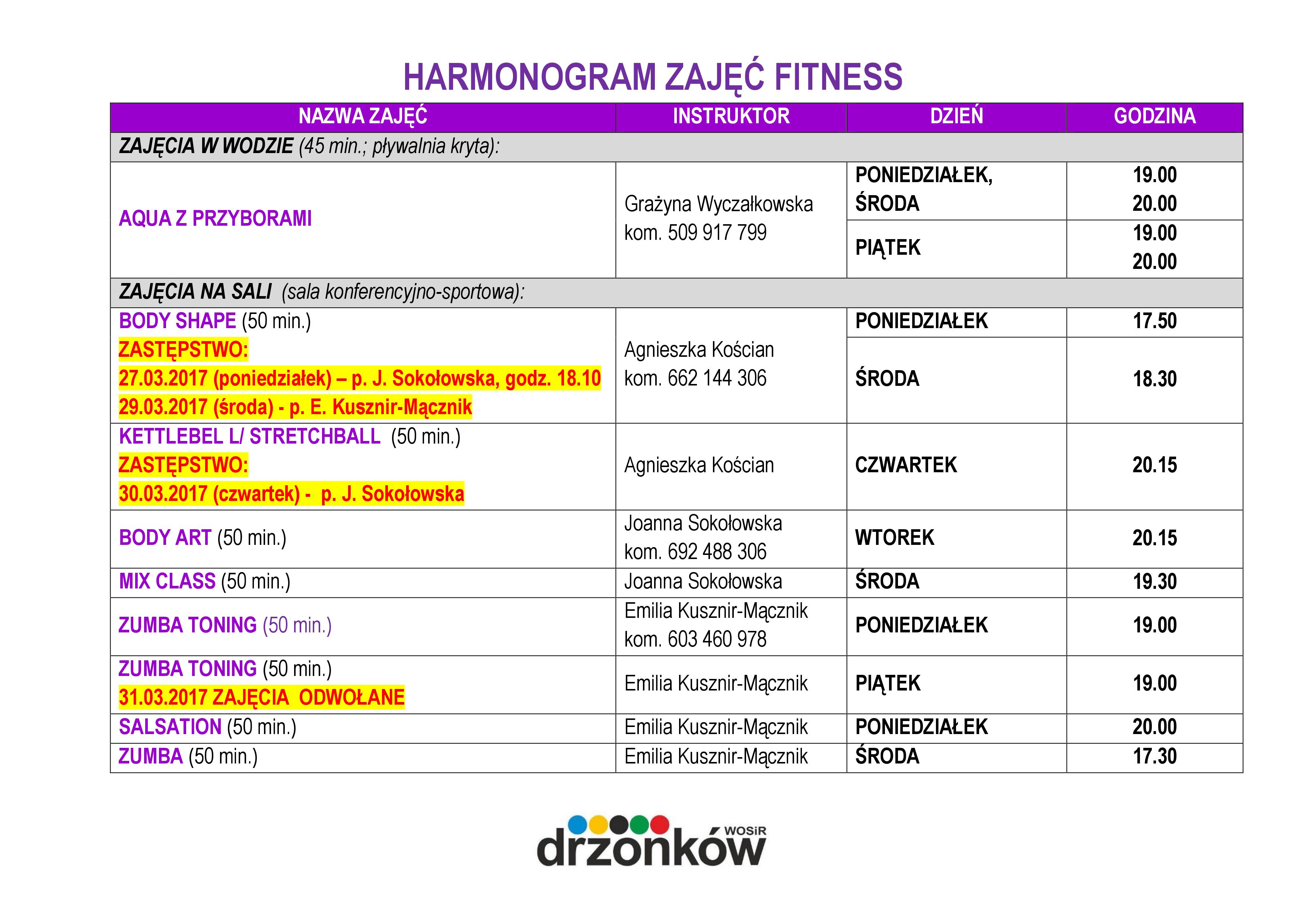 Uprzejmie informujemy, że w harmonogramie fitness następują zmiany, ze względu na nieobecność instruktorek, zgodnie z poniższym wykazem:
