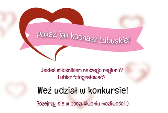 Jesteś miłośnikiem naszego regionu? Lubisz fotografować? Zapraszamy do udziału w naszym konkursie. Z okazji zbliżających się Walentynek przygotowaliśmy konkurs „Pokaż, jak kochasz Lubuskie!”. Wyślij pracę graficzną bądź zdjęcie i wyraź swoje uczucia, za co kochasz Lubuskie. Wszystkie prace 14 lutego br. zaprezentowane zostaną na telebimie przy urzędzie. A jedną z nagród jest sesja zdjęciowa w zabytkowych wnętrzach gorzowskiego muzeum. Zachęcamy do wspólnej zabawy!