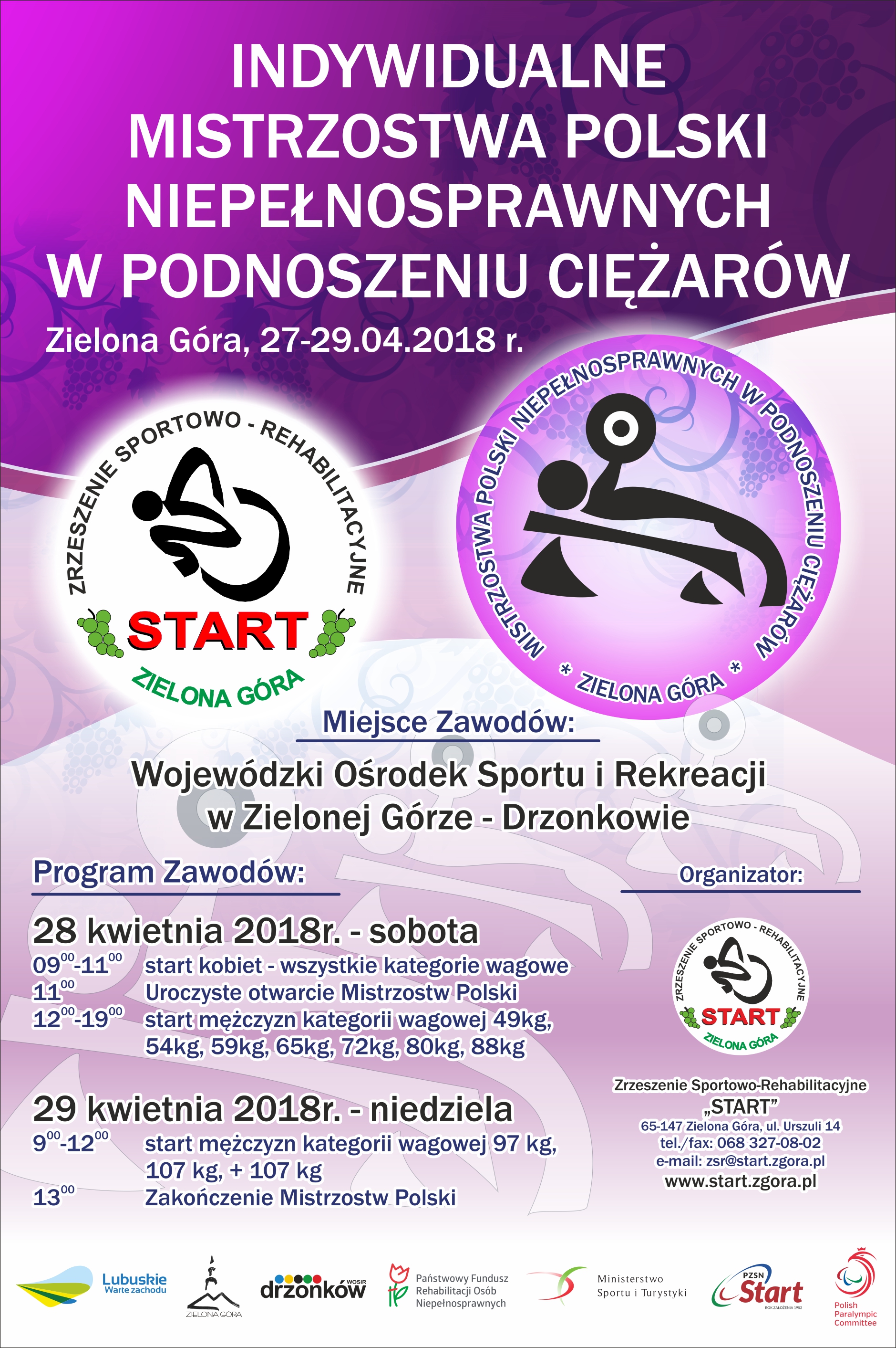 Zrzeszenie Sportowo-Rehabilitacyjne „START” w Zielonej Górze kolejny rok z rzędu jest organizatorem Indywidualnych Mistrzostw Polski Niepełnosprawnych w podnoszeniu ciężarów. Mistrzostwa odbędą się w dniach 27-29 kwietnia 2018 r. w Wojewódzkim Ośrodku Sportu i Rekreacji imienia Zbigniewa Majewskiego w Drzonkowie z udziałem około 100 zawodników z całej Polski. W gronie uczestników Mistrzostw będą najlepsi zawodnicy w kraju, wśród nich członkowie kadry narodowej, medaliści Igrzysk Paraolimpijskich, Mistrzostw Świata, Pucharów Świata i Mistrzostw Europy. Udział wezmą zawodnicy ZSR „Start” Zielona Góra, w tym Marek Trykacz, członek kadry narodowej, zdobywca IV miejsca na Igrzyskach Paraolimpijskich Rio de Janeiro 2016.