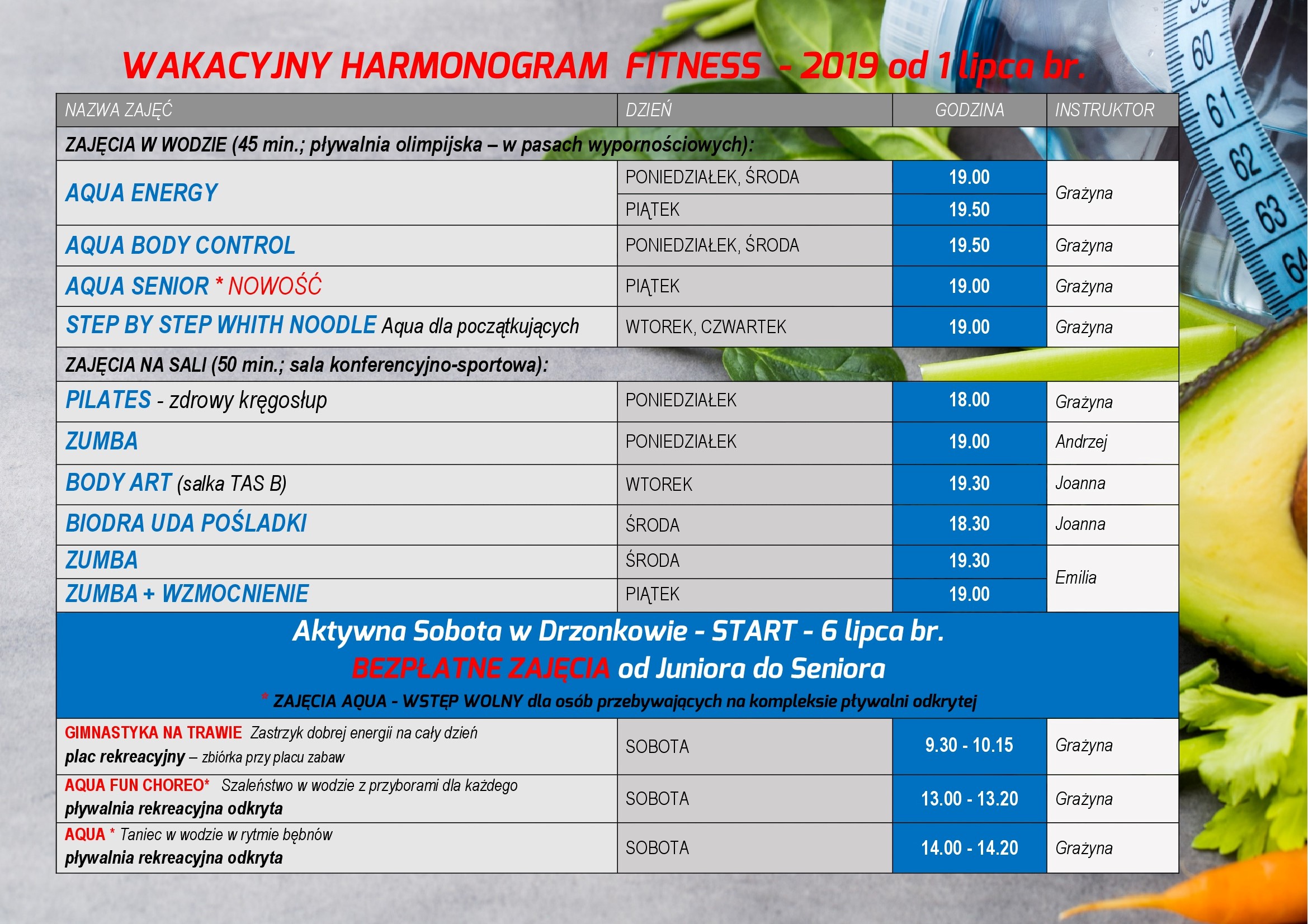 Od1 lipca startujemy z wakacyjnym harmonogramem fitness obowiązującym od poniedziałku do piątku.