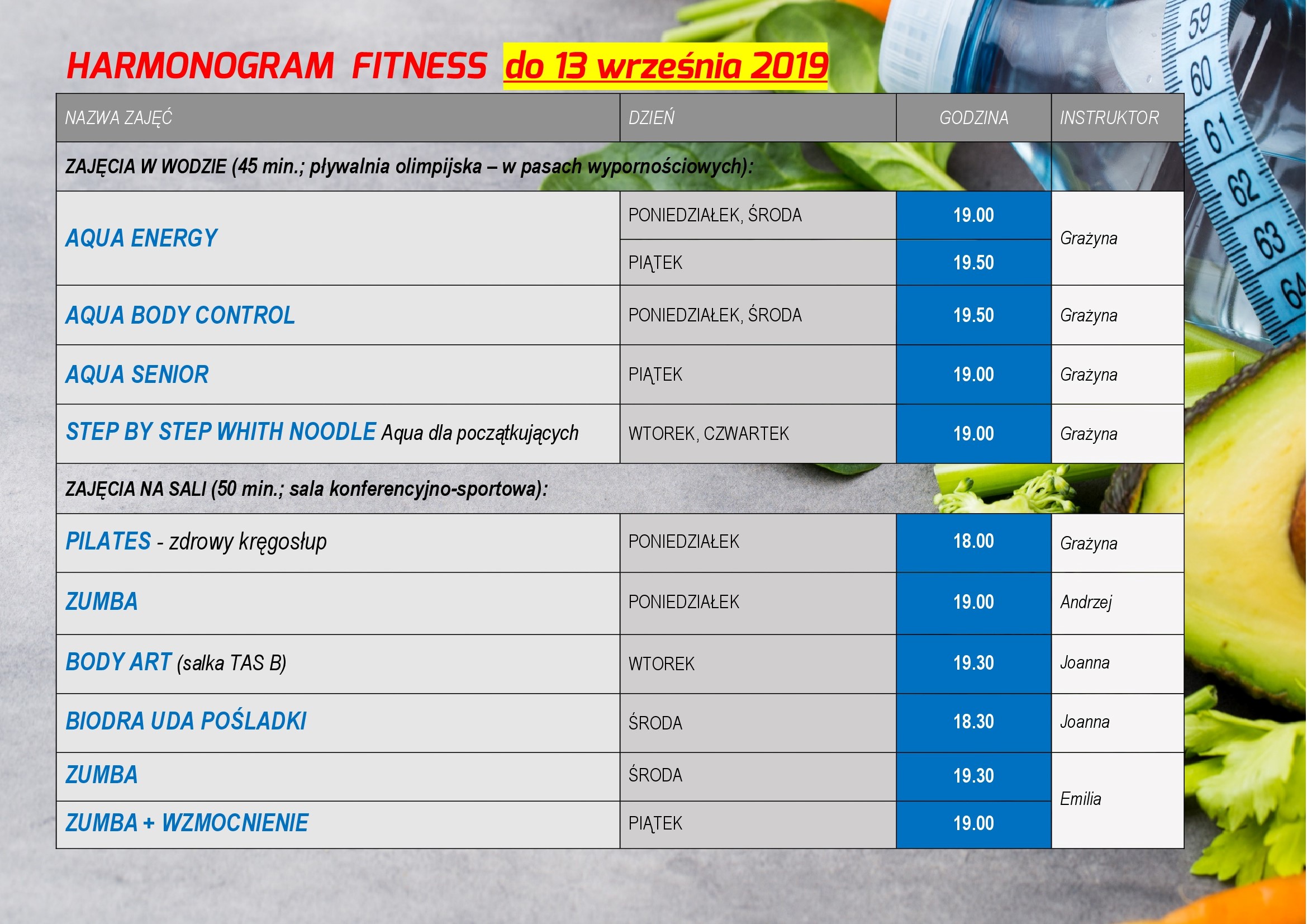 Uprzejmie informujemy, że zajęcia fitness w wodzie i na sali od poniedziałku tj. 2 września br. będą odbywały się wg grafiku letniego aż do 13.09.2019. Zapraszamy serdecznie.