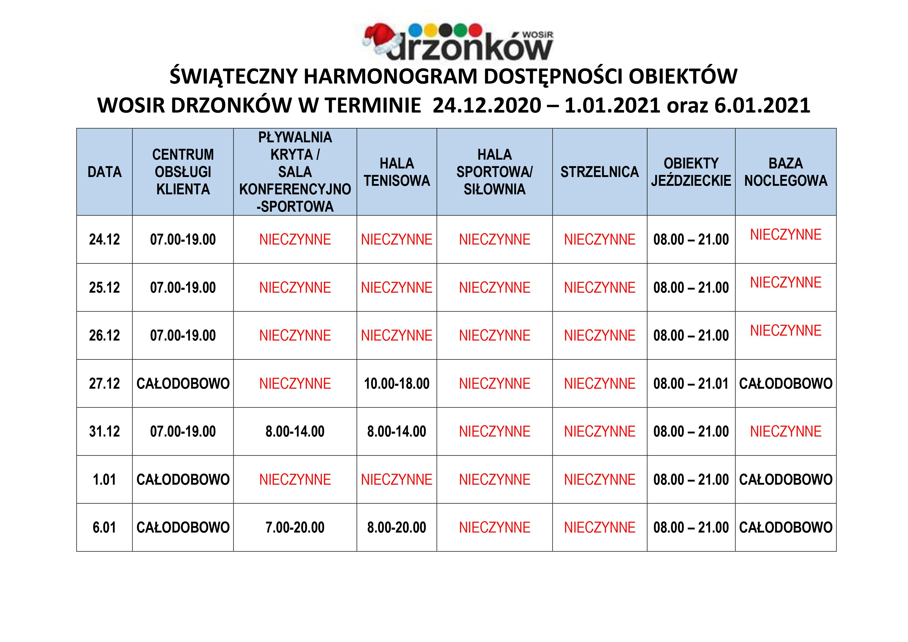 Zapraszamy do zapoznania się z harmonogramem dostępności obiektów w okresie świątecznym .