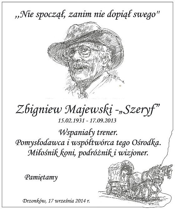 15 września br. odbędzie się spotkanie upamiętniające 10. rocznicę śmierci Śp. Zbigniewa Majewskiego "Szeryfa" założyciela Ośrodka w Drzonkowie. Miejsce: parking - przy pomniku, godz. 14.00.Organizator: WOSiR Drzonków.