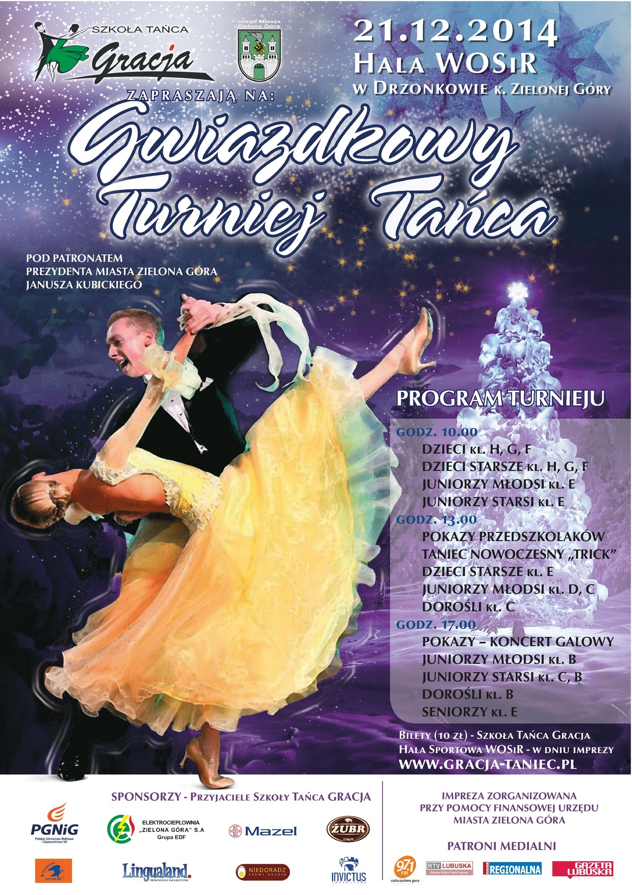 W najbliższą niedzielę, 21. Grudnia 2014, na hali sportowej WOSIR w Drzonkowie k. Zielonej Góry, odbędzie się Gwiazdkowy Turniej Tańca. Zachęcamy do zapoznania się z bogatym programem artystycznym!