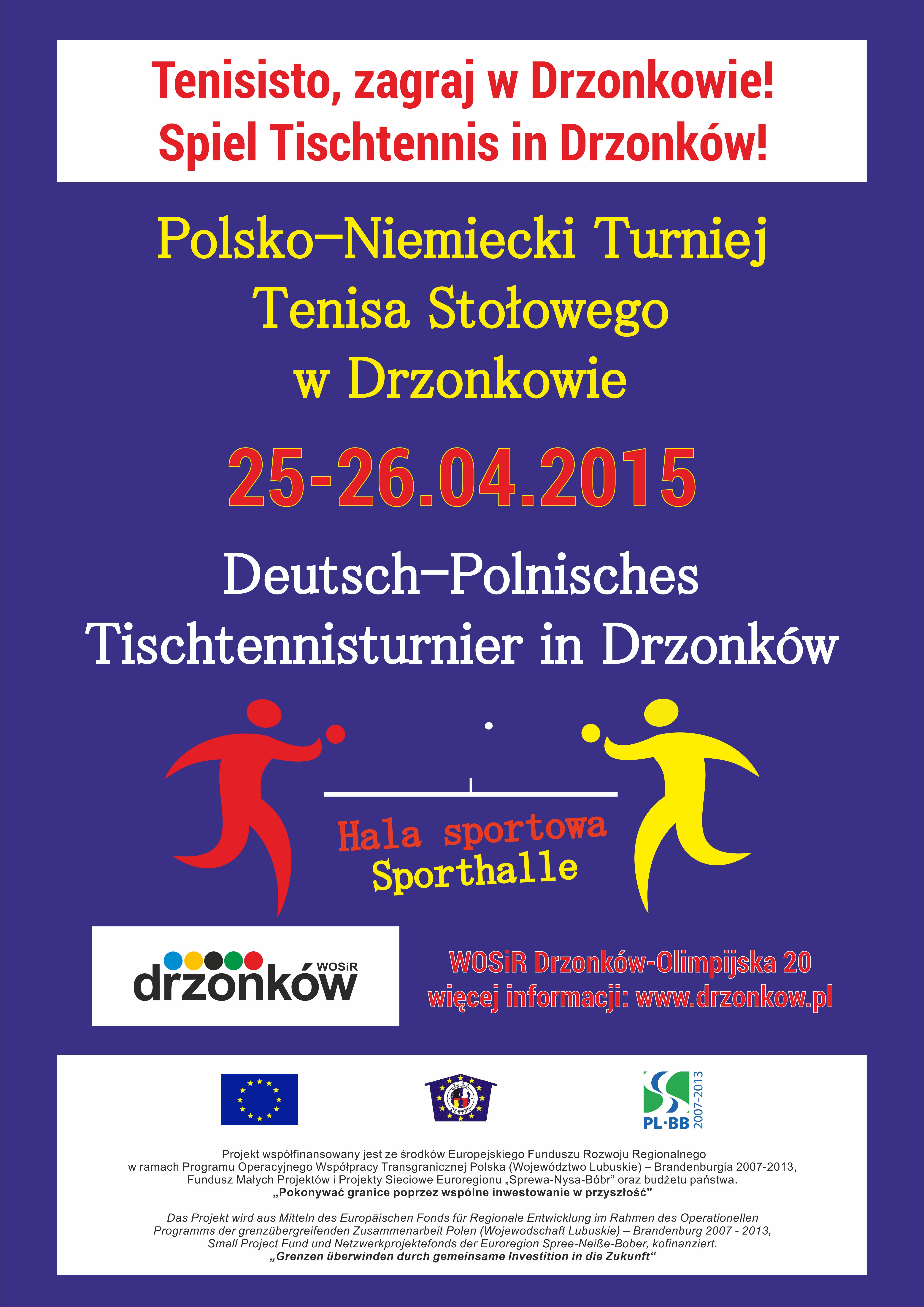 W dniach 25-26.04.2015 r. odbędzie się Polsko- Niemiecki Turniej Tenisa Stołowego. W zawodach wezmą udział tenisiści z województwa lubuskiego, jak również z Landu Brandenburgia. Do udziału zapraszamy dziewczęta i chłopców w grupach wiekowych: 2001-1999, 2004-2002, 2005 i młodsi. Na zwycięzców czekają atrakcyjne nagrody, a na uczestników upominki i dyplomy.