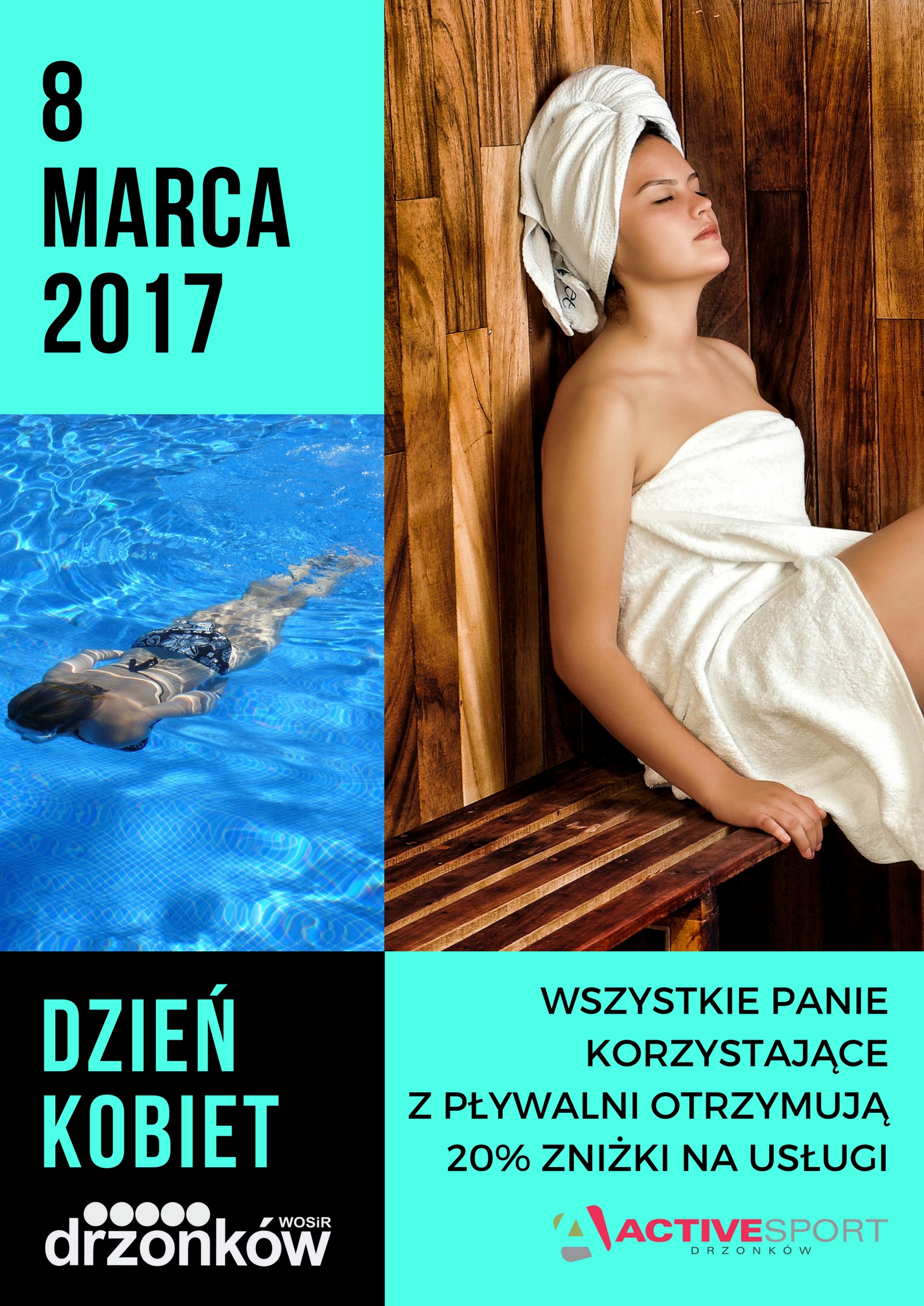 Wszystkie Panie, które skorzystają z naszej pływalni w środę 8 marca br.* otrzymają zniżkę w wysokości 20% na usługi odnowy biologicznej ACTIVESPORT Drzonków. Życzymy udanego relaksu.