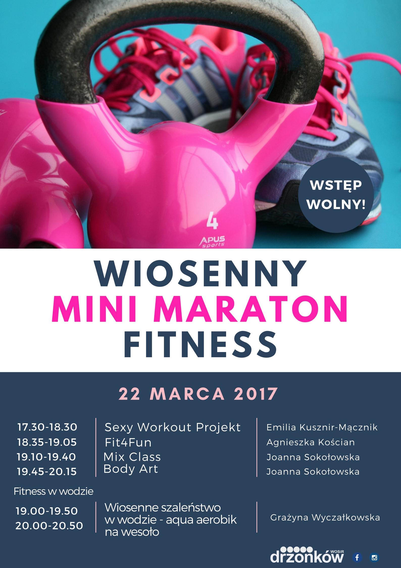 Zapraszamy na Mini Maraton Fitness, który odbędzie się 22 marca br. (środa) w godz. 17.30-20.30 na sali konferencyjno-sportowej z kolei w godz. 19.00-20.50 na pływalni krytej. Zajęcia poprowadzą nasze instruktorki zgodnie z programem:
