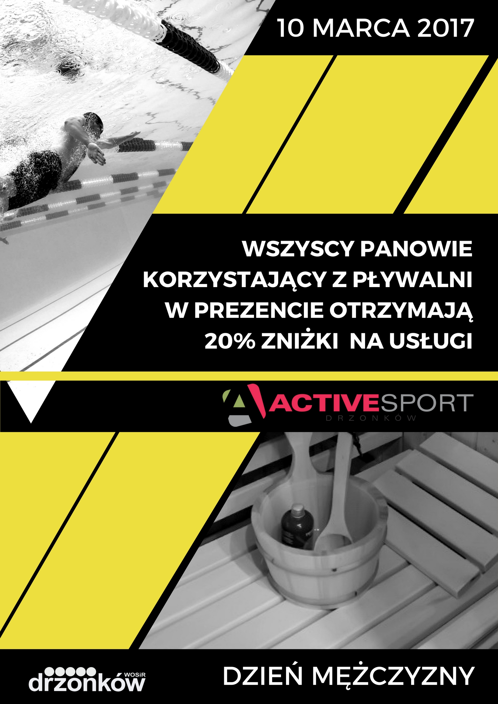 Wszyscy Panowie, którzy skorzystają z naszej pływalni w piątek 10 marca br.* otrzymają zniżkę w wysokości 20% na usługi odnowy biologicznej ACTIVESPORT Drzonków. Życzymy udanego relaksu.