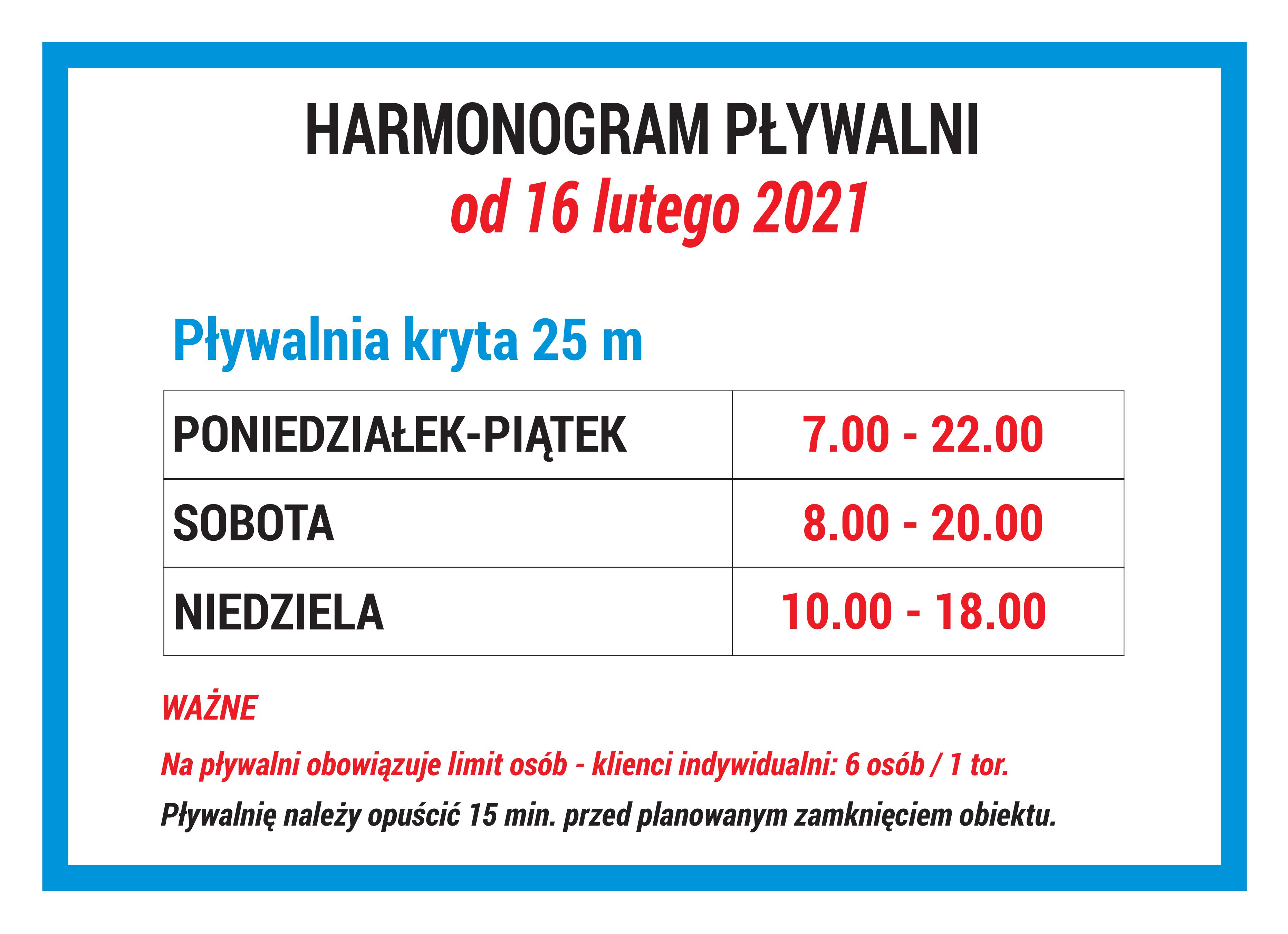 W związku z dużym zainteresowaniem klientów indywidualnych od dnia 16 lutego br. dodatkowo uruchamiamy pływalnię krytą w niedzielę, zgodnie z poniższym harmonogramem.