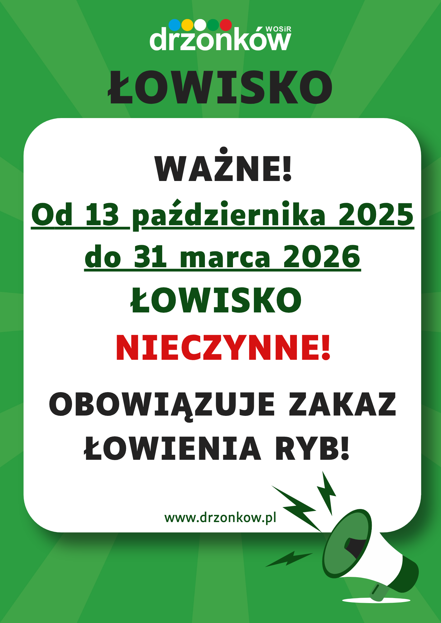WAŻNE! Od 13 października 2025 do 31 marca 2026 łowisko NIECZYNNE!