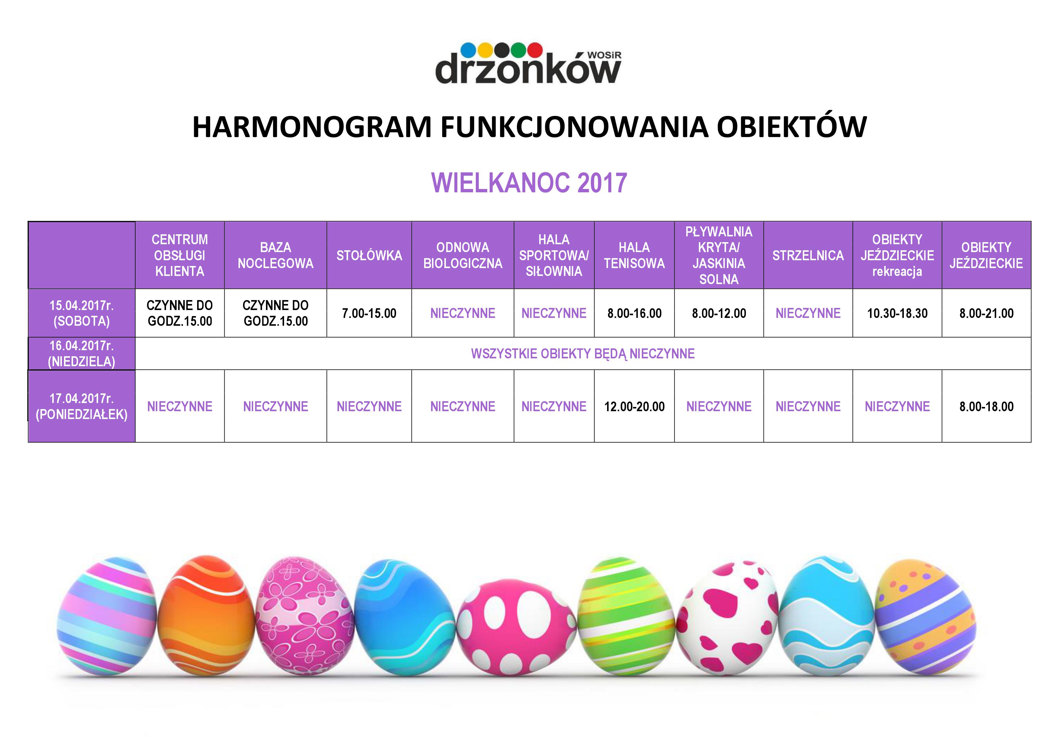 Zapraszamy do zapoznania się z harmonogramem funkcjonowania obiektów WOSiR Drzonków w terminie 15-17 kwietnia 2017r.