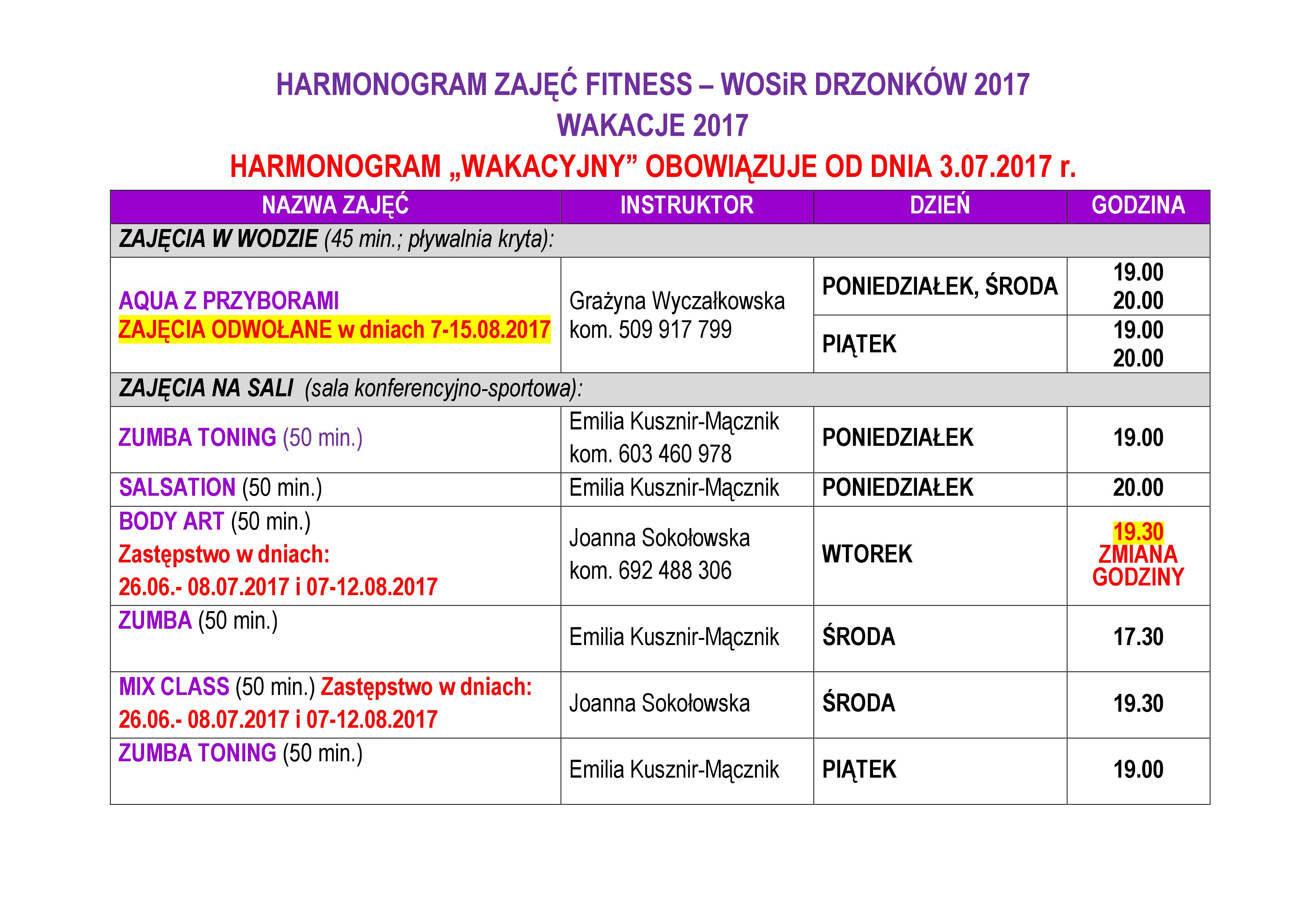 Od 27 czerwca br. zajęcia Body Art rozpoczynają się o godz. 19.30, z kolei od 3 lipca obowiązuje nowy