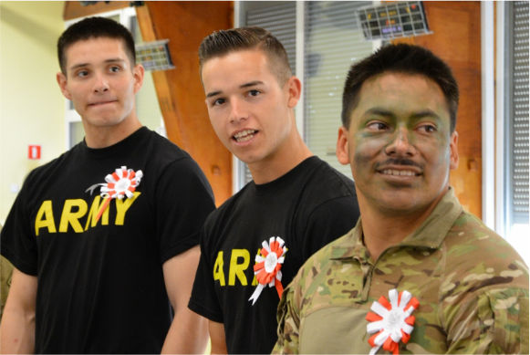 Żołnierze przygotowali dla naszych uczestników wojskową rozgrzewkę oraz mały turniej sprawnościowy. Dzieci miały także okazję przymierzyć umundurowanie oraz wykonać wojskowy makijaż maskujący. Dzięki obecności tłumacza półkoloniści mogli porozmawiać z gośćmi. Na zakończenie spotkania Armia Amerykańska wręczyła najlepszym zawodnikom nagrody a dzieci podarowały własnoręcznie wykonane kotyliony w naszych narodowych barwach.
