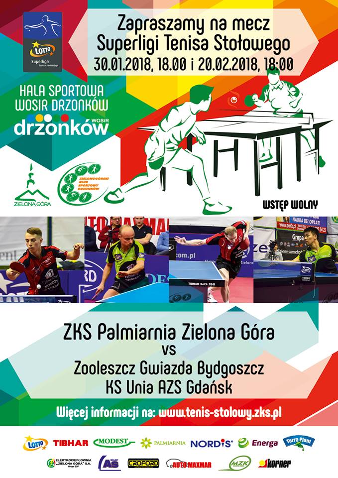 We wtorek 20 lutego w hali sportowej WOSiR Drzonków odbędzie mecz Superligi Tenisa Stołowego. ZKS Palmiarnia podejmie drużynę z Gdańska. Obie drużyny plasują się w środkowej części tabeli. Gospodarze wystąpią w składzie: Lucjan Błaszczyk, Miro Horejsi i Kamil Nalepa, goście: Mikhail Paikov, Marek Badowski. Rozpoczęcie zawodów godzina 18.00. Zapraszamy do kibicownia!