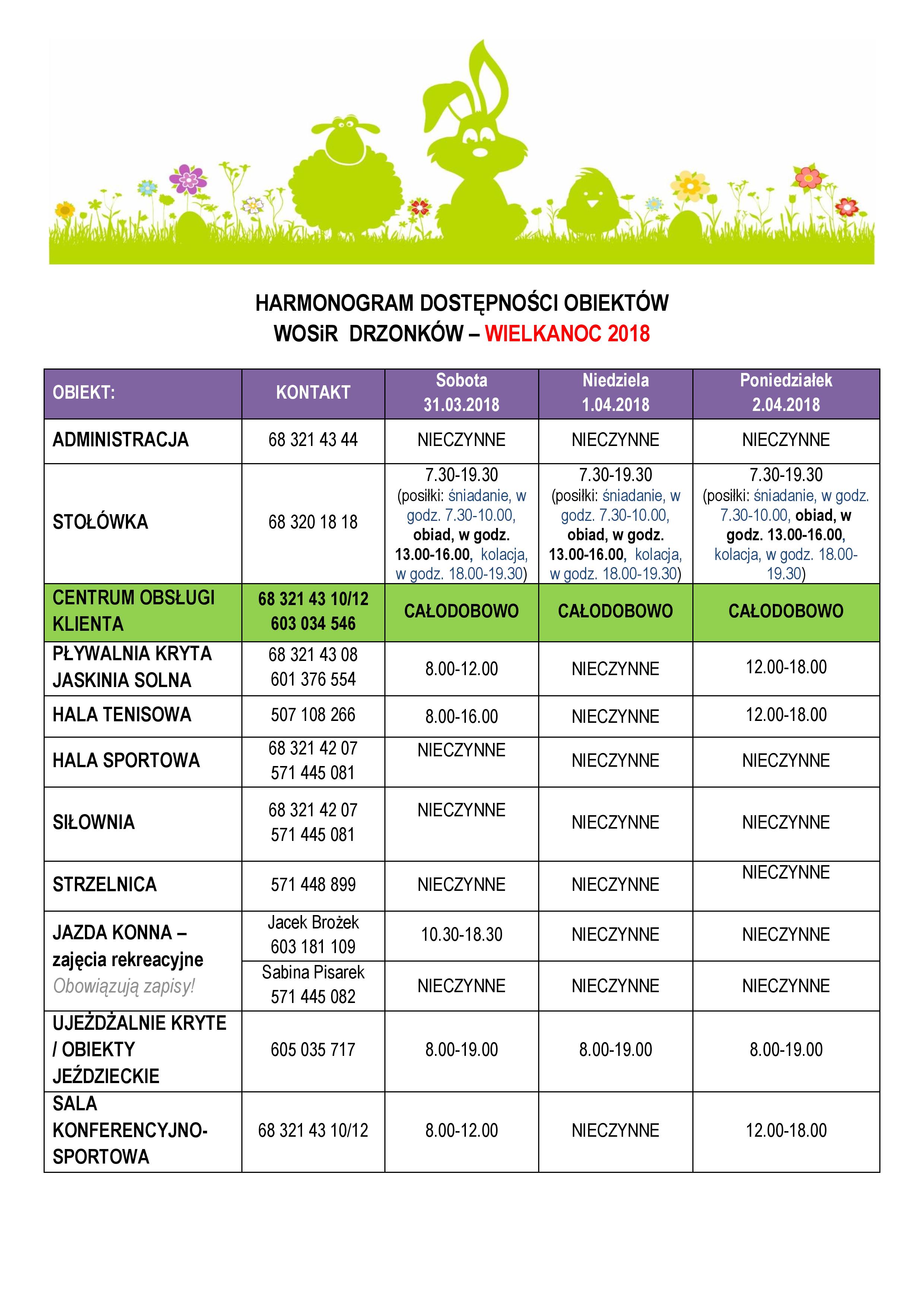 Zobacz aktualny harmonogram dostępności naszych obiektów w czasie ŚWIĄT WIELKANOCNYCH 2018.