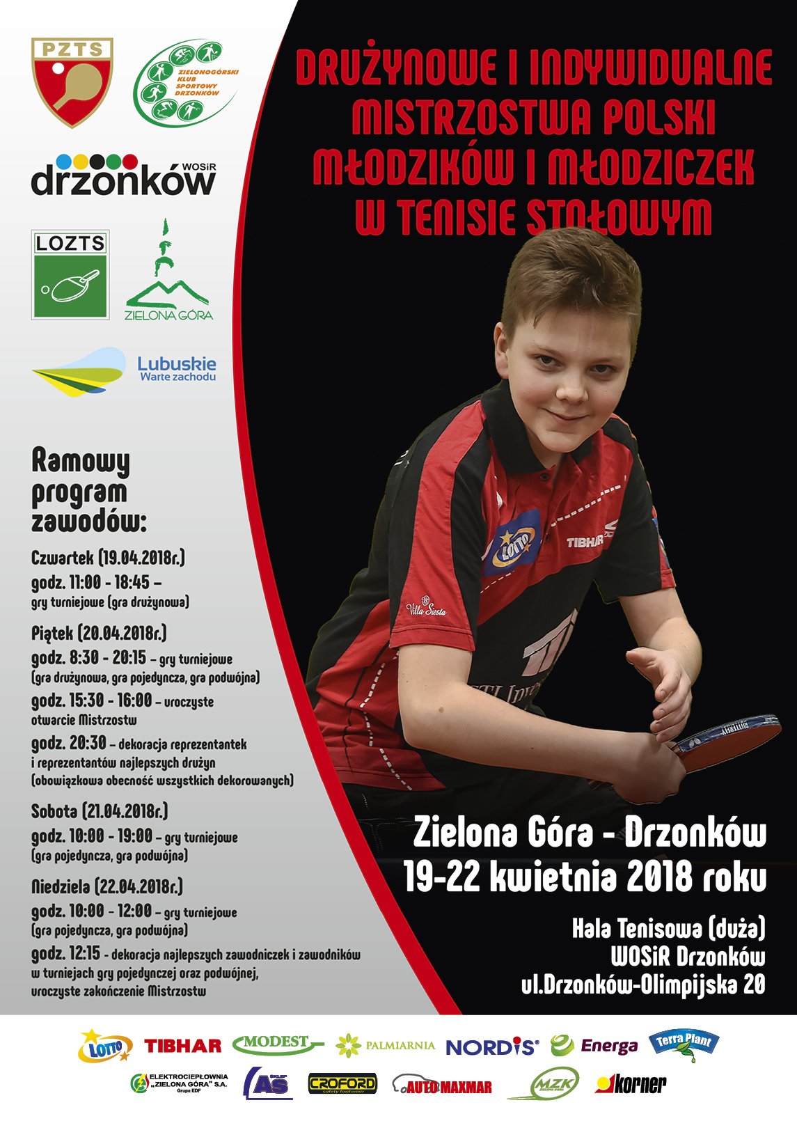 W dniach 19-22 kwietnia 2018 na hali tenisowej odbędą się Drużynowe oraz Indywidualne Mistrzostwa Polski Młodzików i Młodziczek w Tenisie Stołowym. Patronem imprezy jest Prezydent Miasta Zielona Góra - Janusz Kubicki.