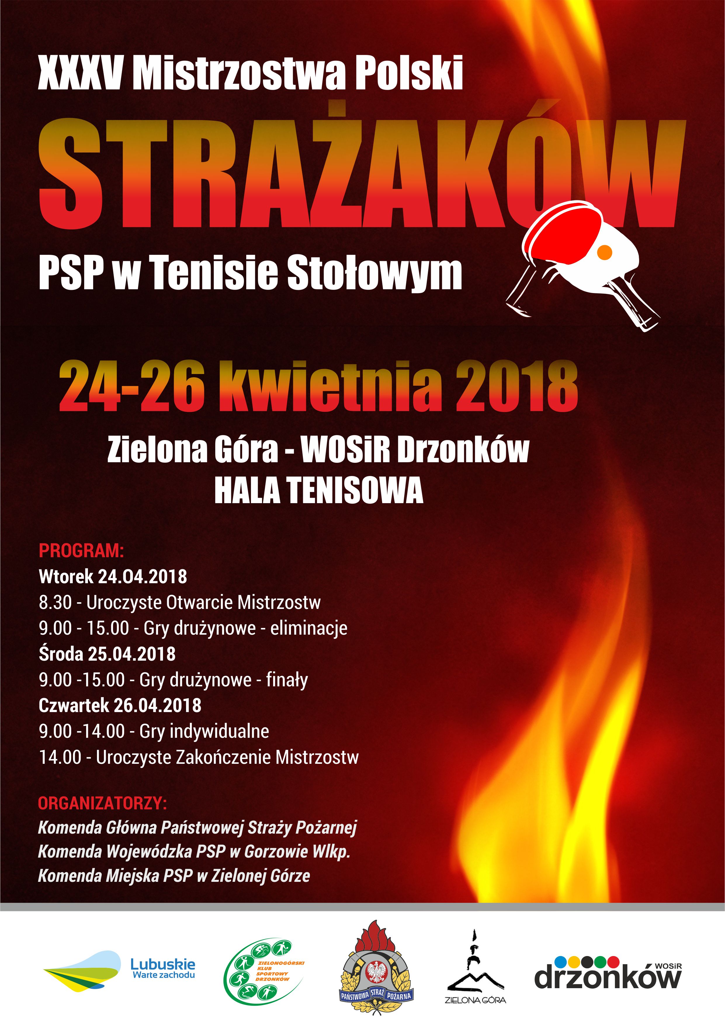 W dniach 24-26 kwietnia 2018 r. w Wojewódzkim Ośrodku Sportu i Rekreacji im. Zbigniewa Majewskiego w Drzonkowie rozegrane zostaną XXXV Indywidualne i Drużynowe Mistrzostwa Polski Strażaków Państwowej Straży Pożarnej w Tenisie Stołowym. Zawody odbędą się w wielofunkcyjnej hali tenisowej a strażacy i tym razem będą dzielnie rywalizować o miejsca na podium. W mistrzostwach udział weźmie 14 drużyn w tym 12 reprezentacji województw: dolnośląskie, lubelskie, lubuskie, mazowieckie, podkarpackie, podlaskie, śląskie, warmińsko-mazurskie, świętokrzyskie, pomorskie, zachodnio-pomorskie i opolskie oraz dwie szkoły PSP: Szkoła Aspirantów PSP w Krakowie i Centralna Szkoła PSP w Częstochowie. Już dziś życzymy sportowych sukcesów!
