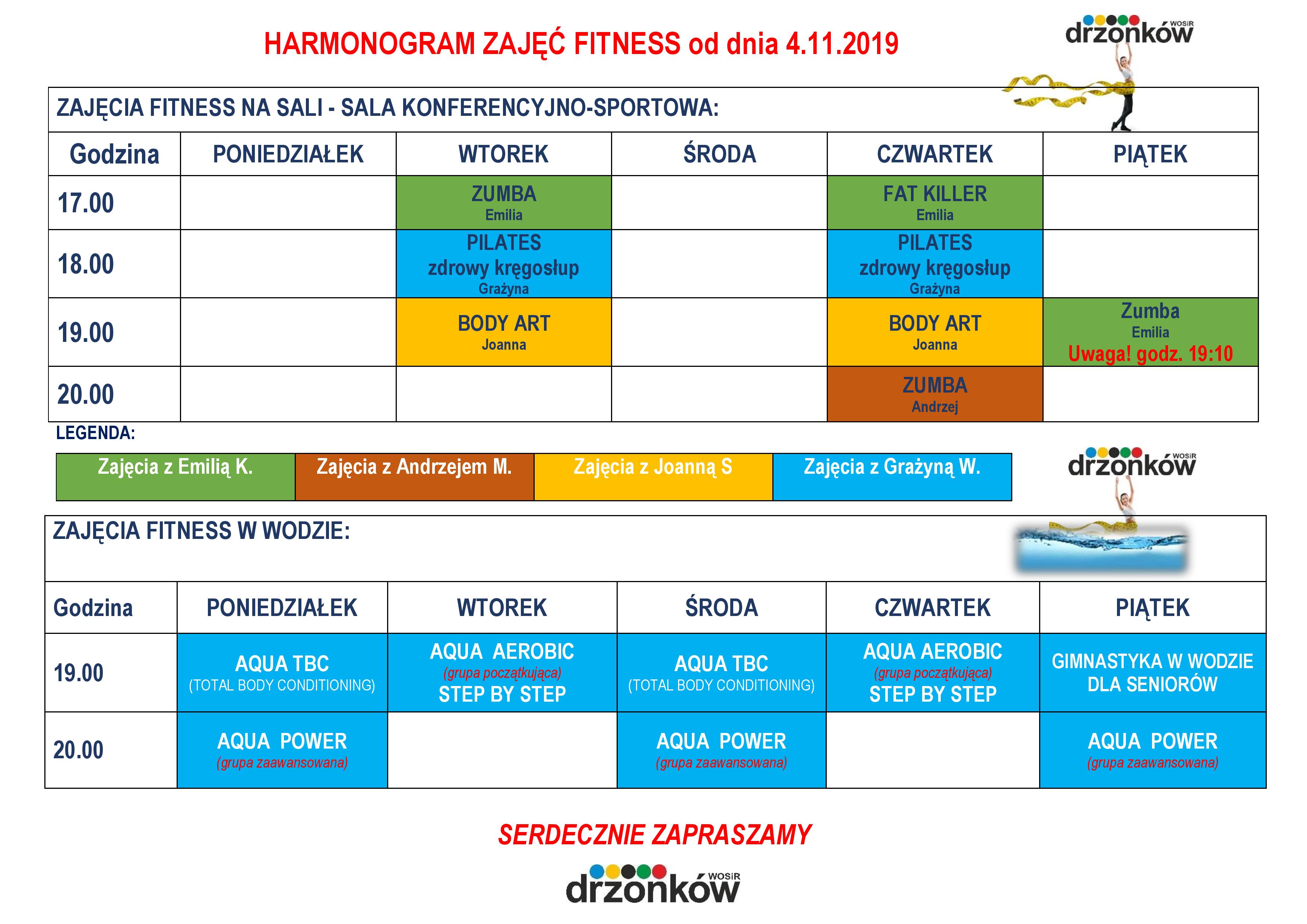 W związku ze zmianą dostępności obiektów dla WOSIR Drzonków, zmuszeni jesteśmy zmienić dotychczasowy harmonogram zajęć fitness na Sali.