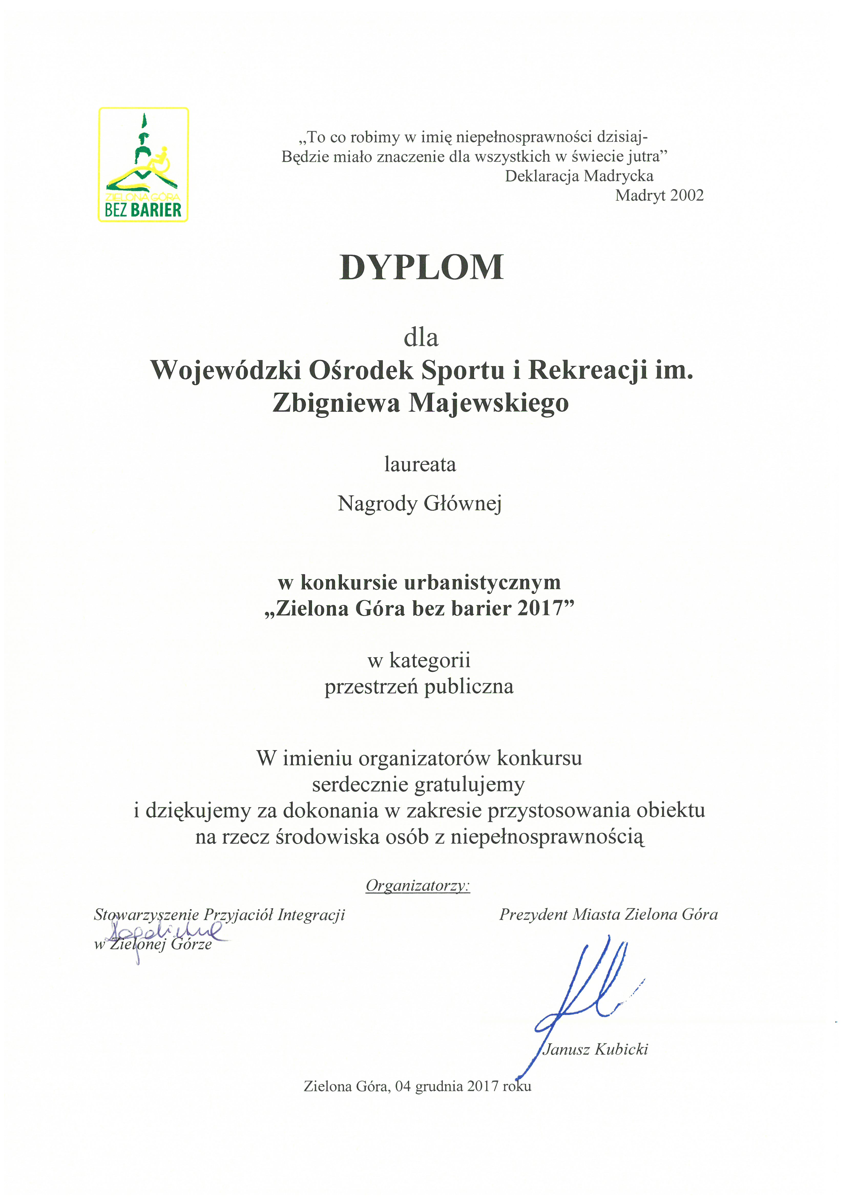 WOSIR DRZONKÓW - LAUREATEM KONKURSU ,,ZIELONA GÓRA BEZ BARIER 2017