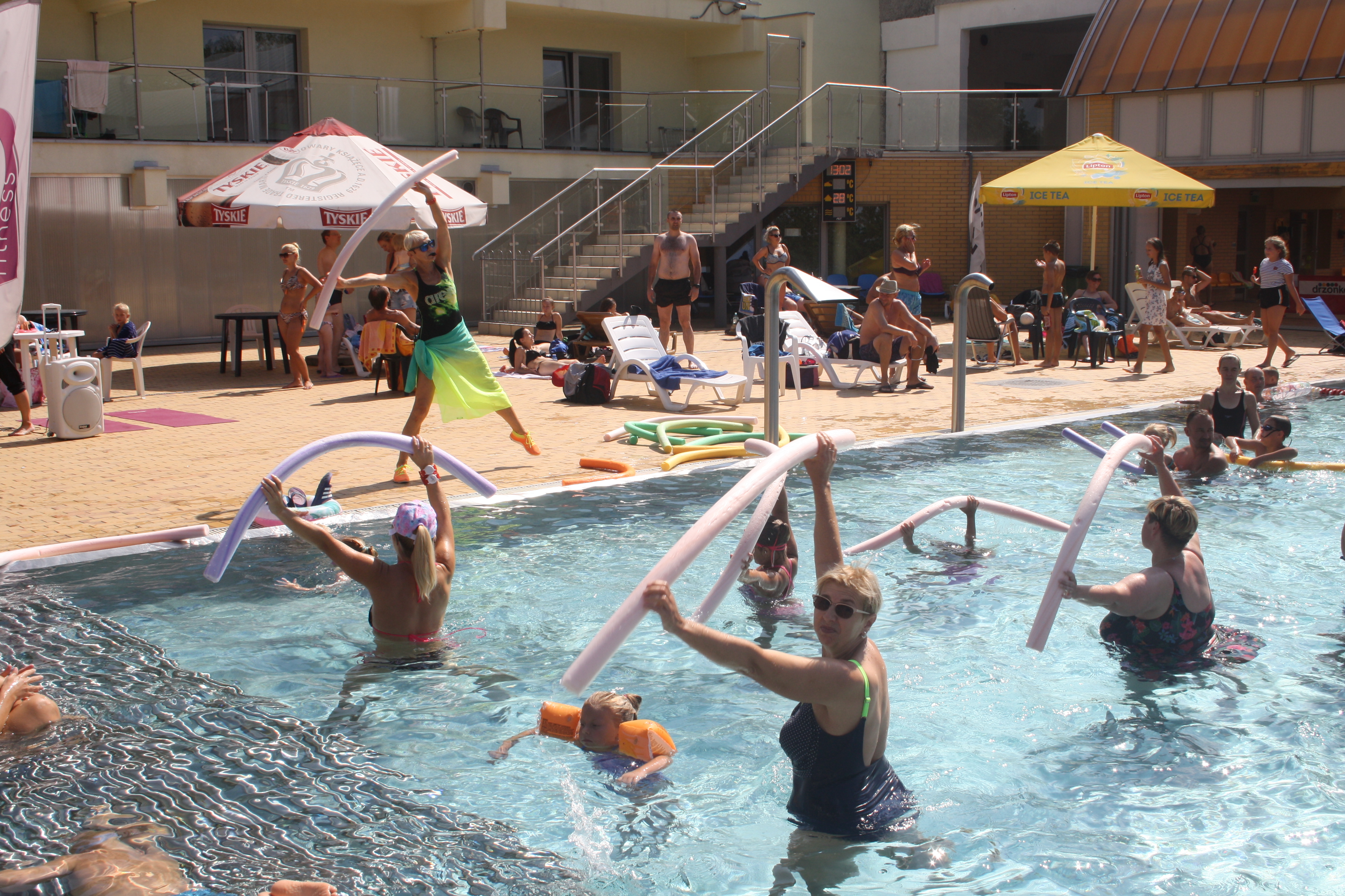 Piękna słoneczna pogoda sprawiła, że basen i plaża kompleksu rekreacyjnego wypełniły się po brzegi. Sportowe atrakcje przygotowane na ten dzień, cieszyły się ogromnym zainteresowaniem zarówno dzieci, jak i dorosłych. Szczególnie dużym powodzeniem cieszył sie aqua areobik i zumba kids oraz kettle.