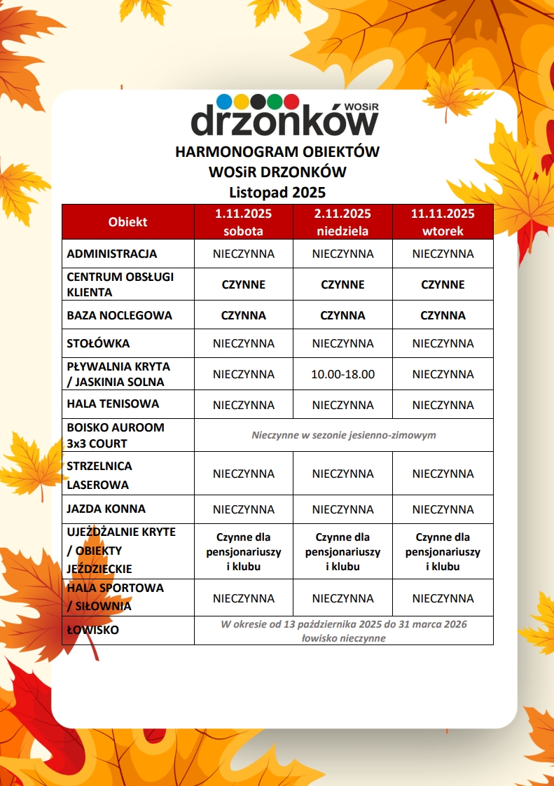 Zobacz harmonogram dostępności naszych obiektów w okresie świąt listopadowych.